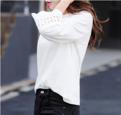 シンプルなデザイン。袖にパンチングレースを施した上品なブラウスです。