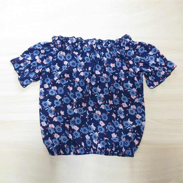 ひらひらフリルと大きめ花柄が可愛い、オフショルダーブラウスです。