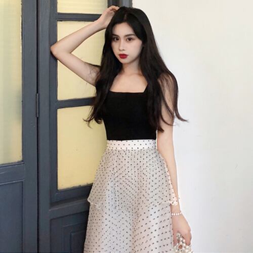 ドット柄 ロング スカート フリル フレア 水玉 レディース チュール ホワイト