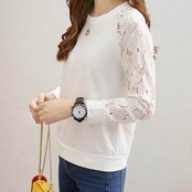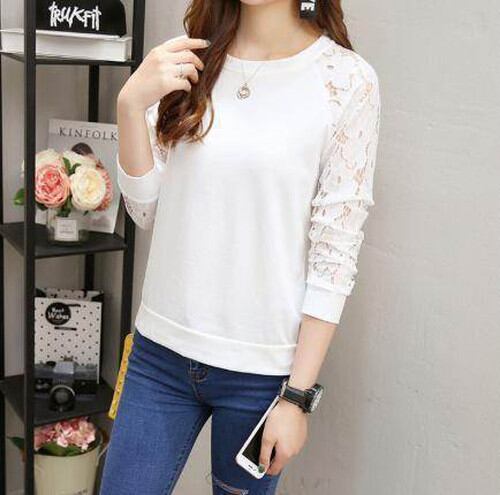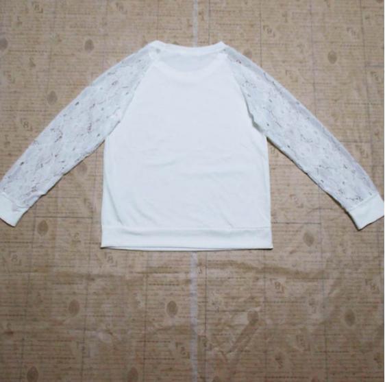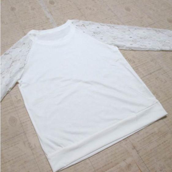 (白色、L) 長袖トップス 袖レース 花柄レース プルオーバー ラウンドネック