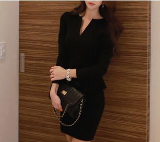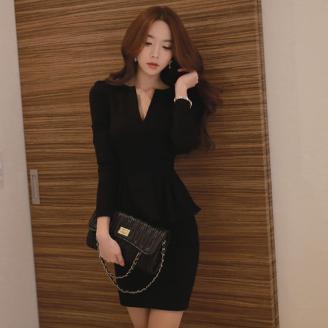 視線が集まる 胸元 Vネック、ふわりと広がる ウエスト部分の ペプラム フリル のアクセント、スタイルは 計算されたシルエットで キレイ見せ 、女性を魅力的に見せる ミニワンピース です。