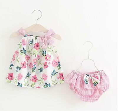 とてもかわいい花柄の女の子ワンピースとフリルのパンツの二点セットです。