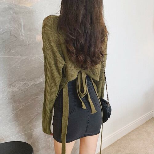フロントは シンプル な ケーブル編みセーター 、 バックスタイル は長さのある ひもリボン を結んだり下げたり 、背中の ちら見せ で グッとおしゃれ魅せ !