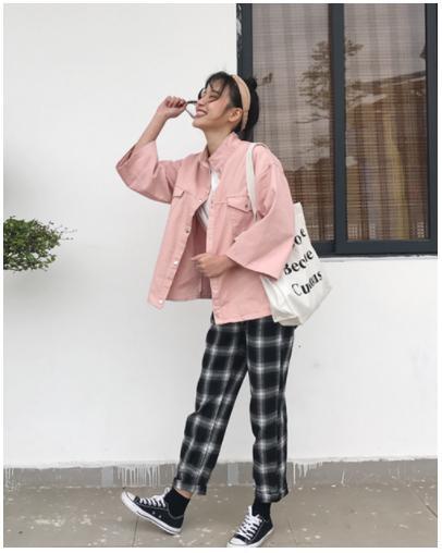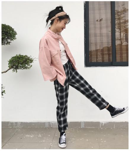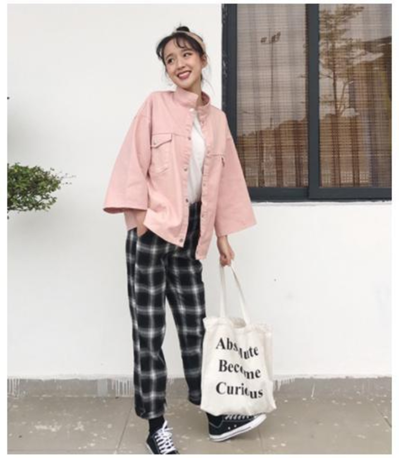 タータンチェックが個性的で今年らしいコーデを引き立ててくれます。